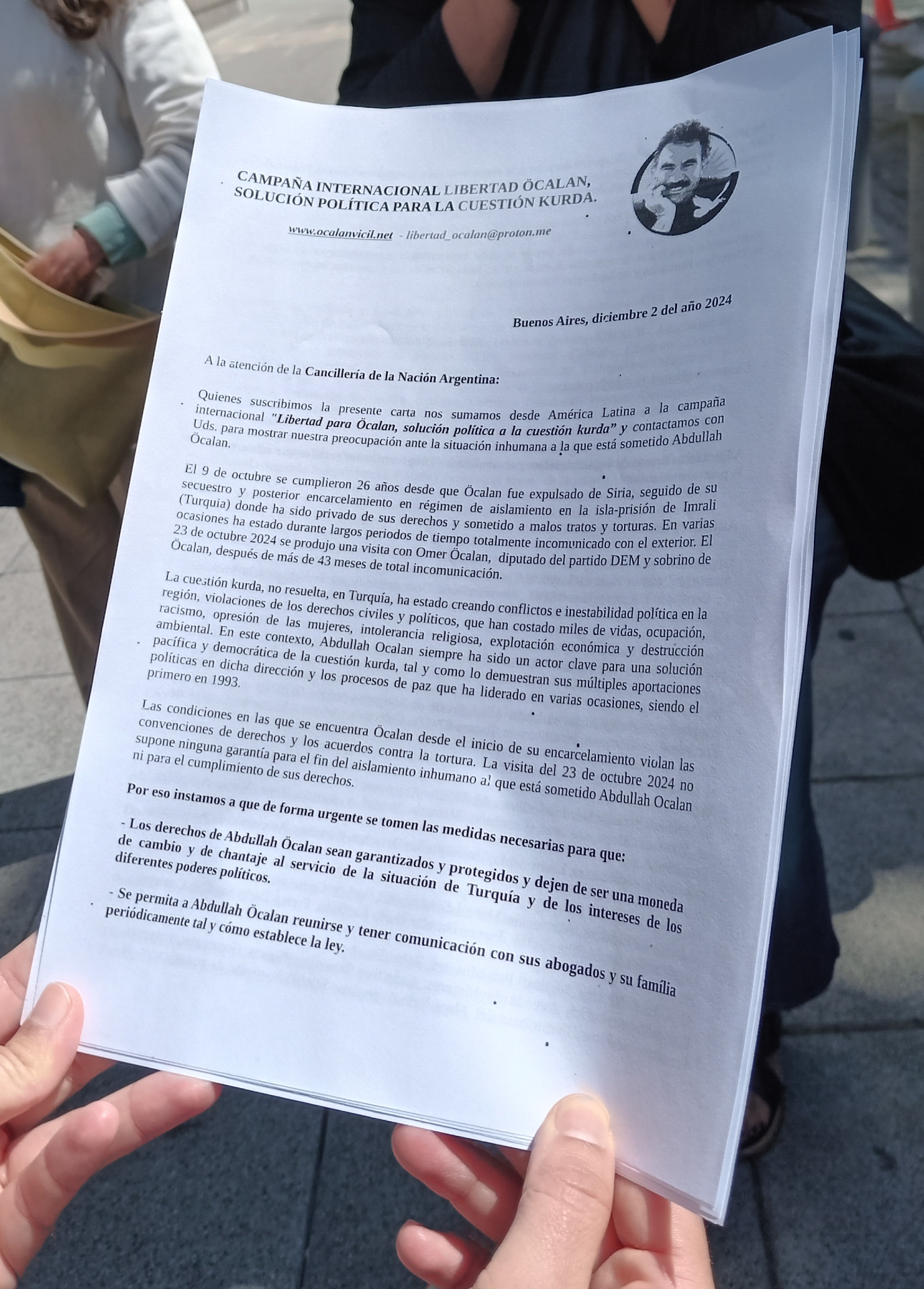 Un grupo de representantes de organismos de derechos humanos y sindicatos de Argentina entregaron un petitorio que demanda la libertad del líder kurdo Abdullah Öcalan, encarcelado en Turquía desde 1999.