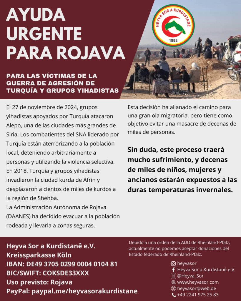 En una declaración pública, la Media Luna Roja Kurda (Heyva Sor a Kurdistanê) explicó que el 27 de noviembre pasado “grupos yihadistas apoyados por Turquía atacaron Alepo, una de las ciudades más grandes de Siria. El Ejército Nacional Sirio (ENS), liderado por Turquía, están aterrorizando a la población local, deteniendo arbitrariamente a personas y utilizando la violencia selectiva”.