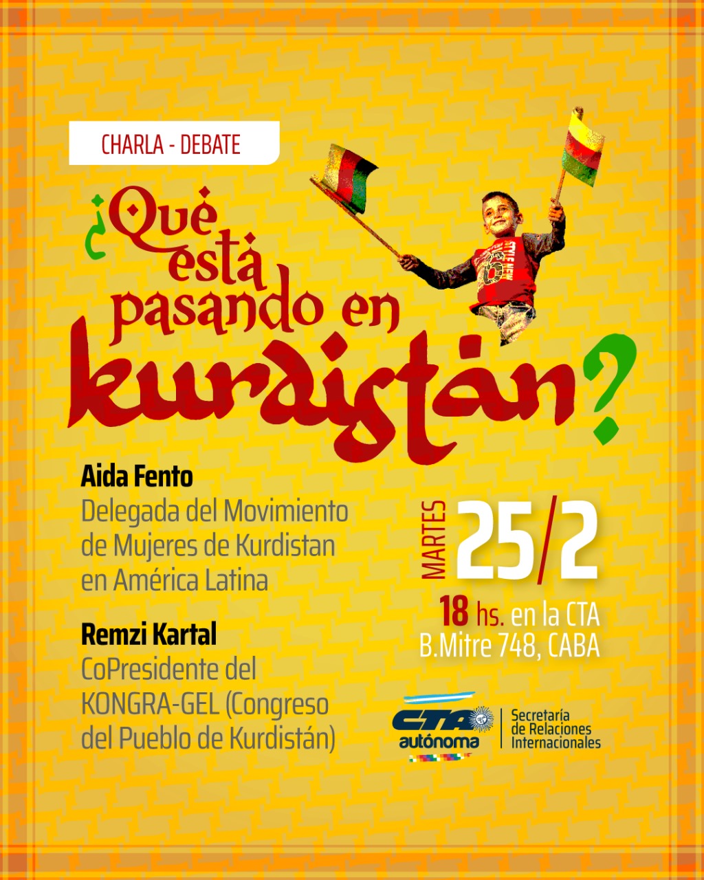 El martes 25 de febrero, a las 18 horas, se realizará la charla “¿Qué está pasando en Kurdistán”, en la sede de la Central Argentino de los Trabajadores (CTA), en la calle Bartolomé Mitre 748 de la ciudad de Buenos Aires.