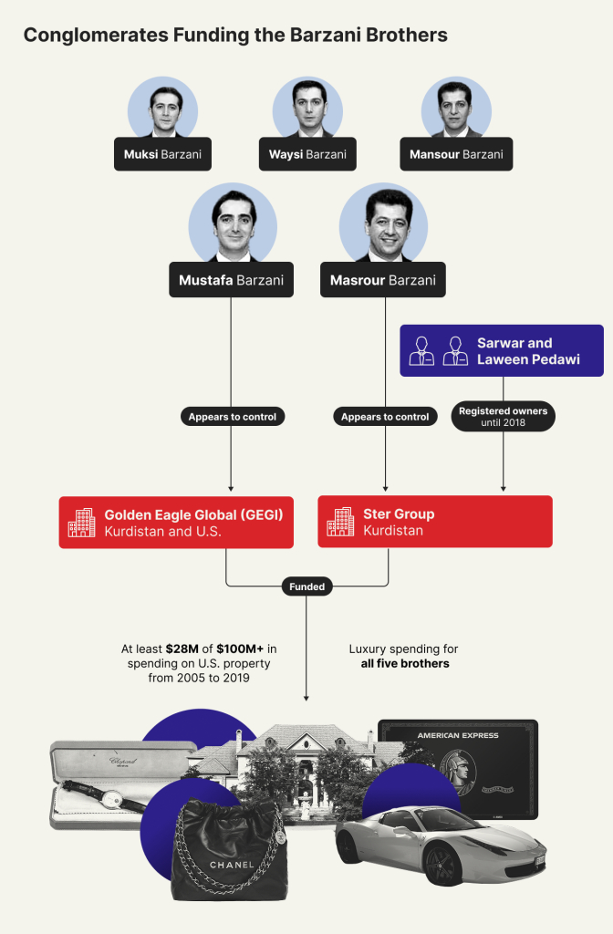 El conglomerado Golden Eagle Global no tiene vínculos de propiedad con la familia Barzani que se hayan hecho públicos. Sin embargo, los documentos filtrados sugieren que el negocio está controlado por Mustafa Barzani, el menor de los hermanos, y detallan el papel que desempeñó en la financiación del estilo de vida de los cinco.