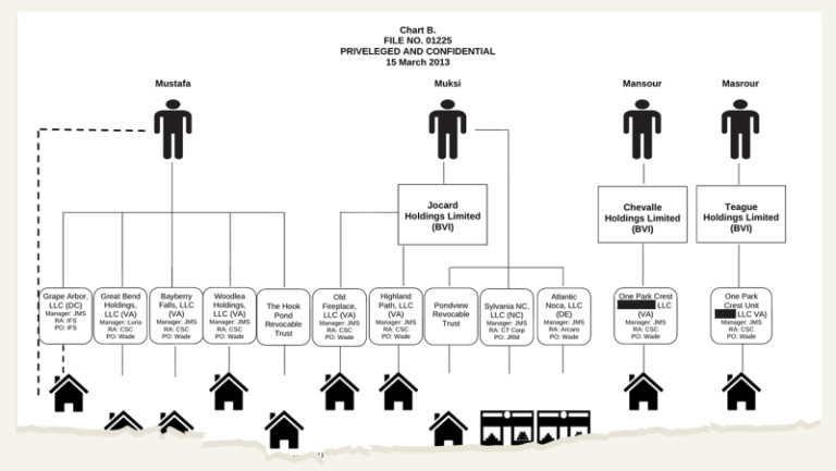 Aunque el memorándum de 2020 no nombraba a la entidad kurda que enviaba los fondos, un memorándum anterior de Moore identifica a GEG Kurdistán como la fuente de las transferencias a Estados Unidos. Mustafa parece haber utilizado esta estructura para pagar al menos tres propiedades, por un valor superior a 10 millones de dólares. En el caso de Casa Divina, por ejemplo, los documentos de preparación de impuestos del bufete de abogados de Moore muestran que la financiación se declaró como una donación extranjera. Los documentos bancarios muestran que el dinero se transfirió a través de una cuenta del bufete de abogados de Moore, que en documentos internos se identificaba como depositaria de los fondos de GEGI.
