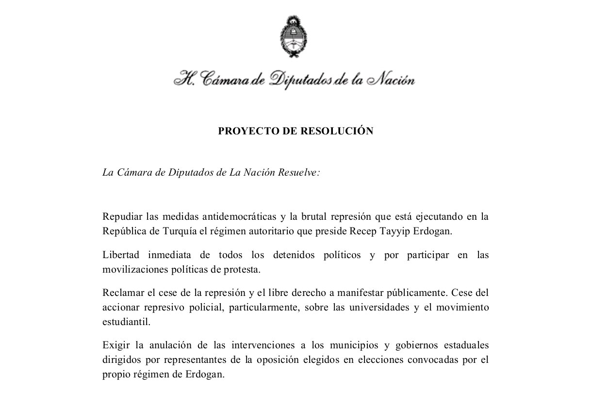 La iniciativa fue presentada por la diputada Vanina Biasi, del Partido Obrero (PO), que declaró que el régimen turco beneficia a los capitalistas turcos y a la OTAN, descarga un brutal ajuste sobre el pueblo y persigue a la izquierda y la juventud estudiantil para ‘prevenir’ que se organicen en su resistencia”.